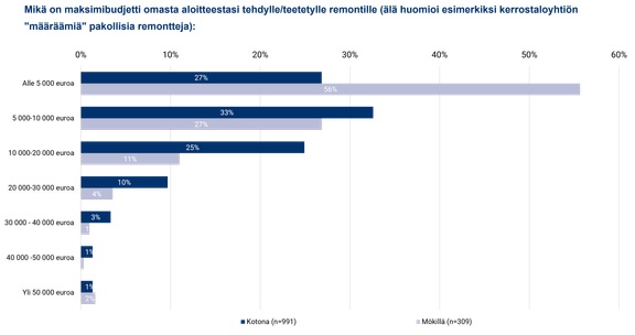 Kotiin sen sijaan ollaan valmiita panostamaan enemmän. Omasta aloitteesta tehtävään remonttiin – siis pois lukien niin sanotut pakolliset, taloyhtiön määräämät remontit – suomalainen kodinomistaja on yleisimmin (33 %) valmis sijoittamaan 5 000–10 000 euroa. Neljäsosa asettaa maksimibudjettinsa välille 10 000–20 000 euroa ja kymmenesosa vastaajista tuota seuraavaan kymppitonnihaarukkaan.