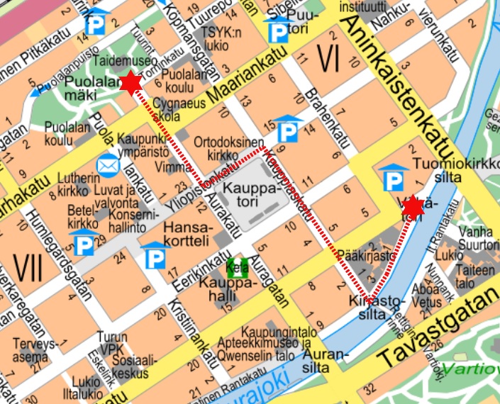 Marssi lähtee Puolalanmäeltä ja kulkee reitillä Aurakatu–Yliopistonkatu–Kauppiaskatu–Läntinen Rantakatu–Vähätori.