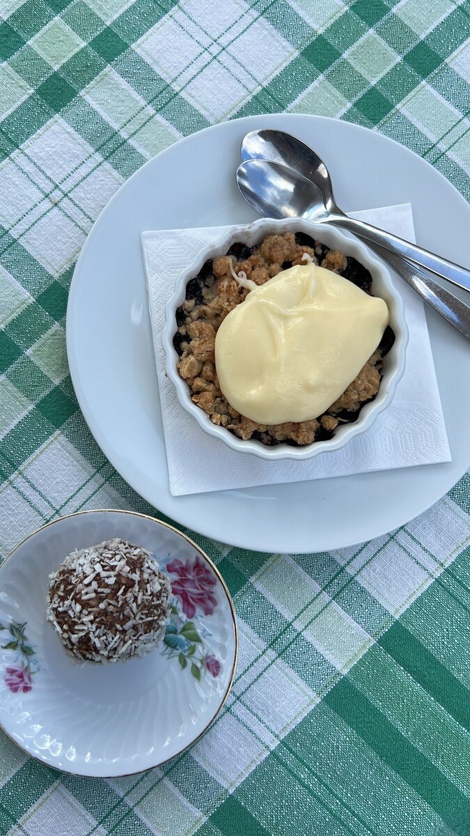 Fika-hetki on helppo järjestää myös kotona tai kotipihalla, kun herkut ovat helppoja ja nopeita tehdä. Kuten nämä kookospallot ja pienet mustikkapiiraat. Kookospallot eli suklaapallot ovat etenkin ruotsissa suosittuja kahviherkkuja, ja niitä oli tarjolla melkeinpä jokaisessa kahvilassa myös Ahvenanmaalla. Niin pienet mustikkapiiraat, kuin kookospallotkin ovat niin vaivattomia ja helppoja, että herkut valmistuvat vaikka pikkuleipureiden avuliaissa käsissä. Leipomiseenkaan ei tarvita kulhoa, desimittaa sekä vispilää kummempia välineitä.