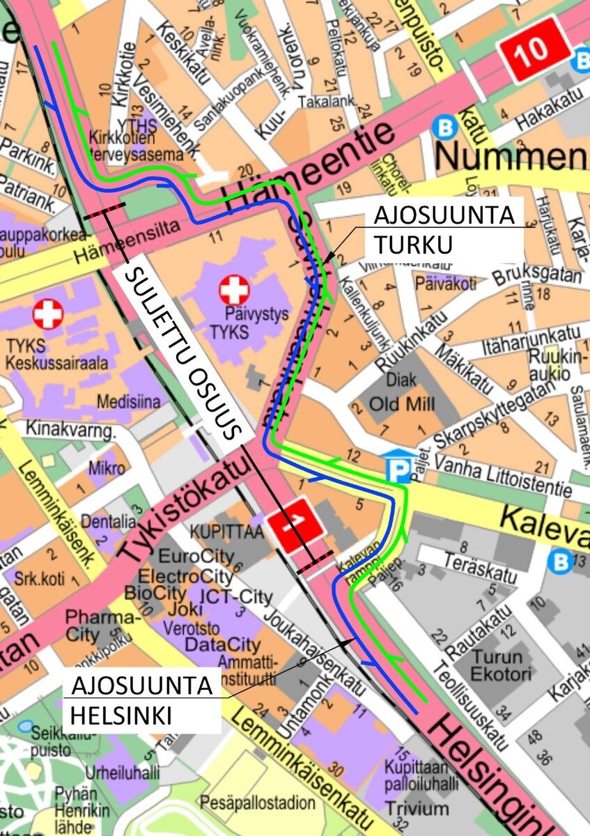Kiertotie ohjataan reitille Hämeenramppi–Hämeentie–Savitehtaankatu–Kalevantie–Kalevanramppi.