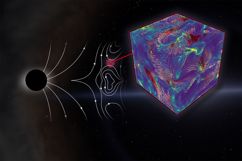 Helsingin yliopiston tutkijat mallinsivat erittäin tarkoilla supertietokonesimulaatioilla, miten säteily, plasma ja magneettikentät mustan aukon ympärillä vuorovaikuttavat. Selvisi, että magneettikenttien aiheuttamat kaoottiset liikkeet – turbulenssi – kuumentavat paikallista plasmaa ja saavat sen säteilemään.