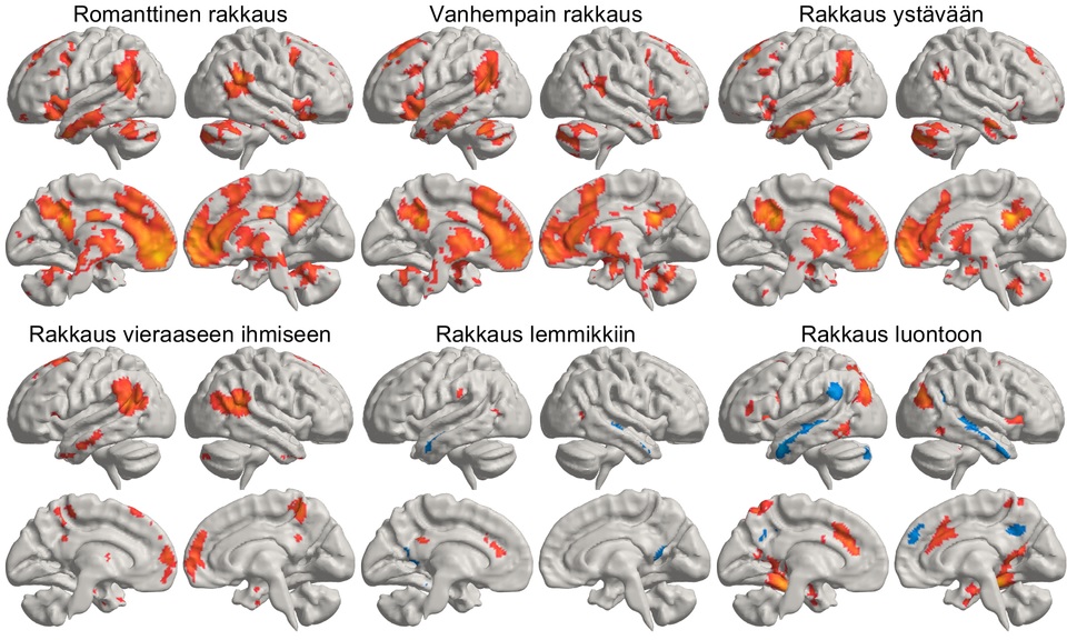 Aalto-yliopiston tutkijat kartoittivat millaista aivotoimintaa kuusi eri rakkauden lajia saa aikaan. Aivot aktivoituvat rakkaudesta läheisiä kohtaan erityisesti palkintojärjestelmän ja sosiaalisen aivotoiminnan alueilla.