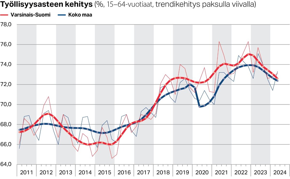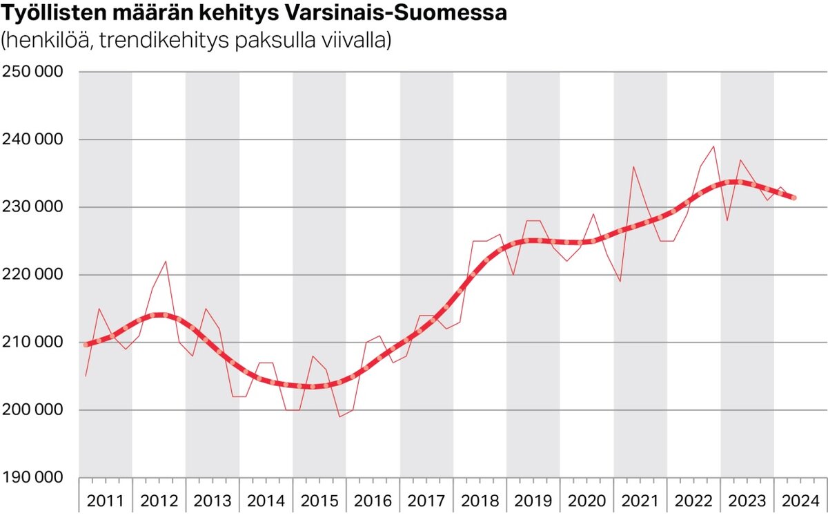 Työllisyysasteen heikkeneminen on jatkunut, vaikka alkuvuodesta näkyi hetkellisesti merkkejä kehityksen pysähtymisestä. Varsinais-Suomen työllisyysaste on kuitenkin yhä koko maan tilannetta parempi. Myös työllisten määrän kehitystrendi kääntyi hienoiseen laskuun. Työ- ja elinkeinoministeriön (TEM) lyhyen aikavälin työmarkkinaennusteen mukaan Suomen työllisyystilanne paranee kuluvan vuoden loppupuolella. Ennusteen toteutuessa pitäisi myös Varsinais-Suomen työllisyystilanteen kehittyä parempaan suuntaan kesän jälkeen.