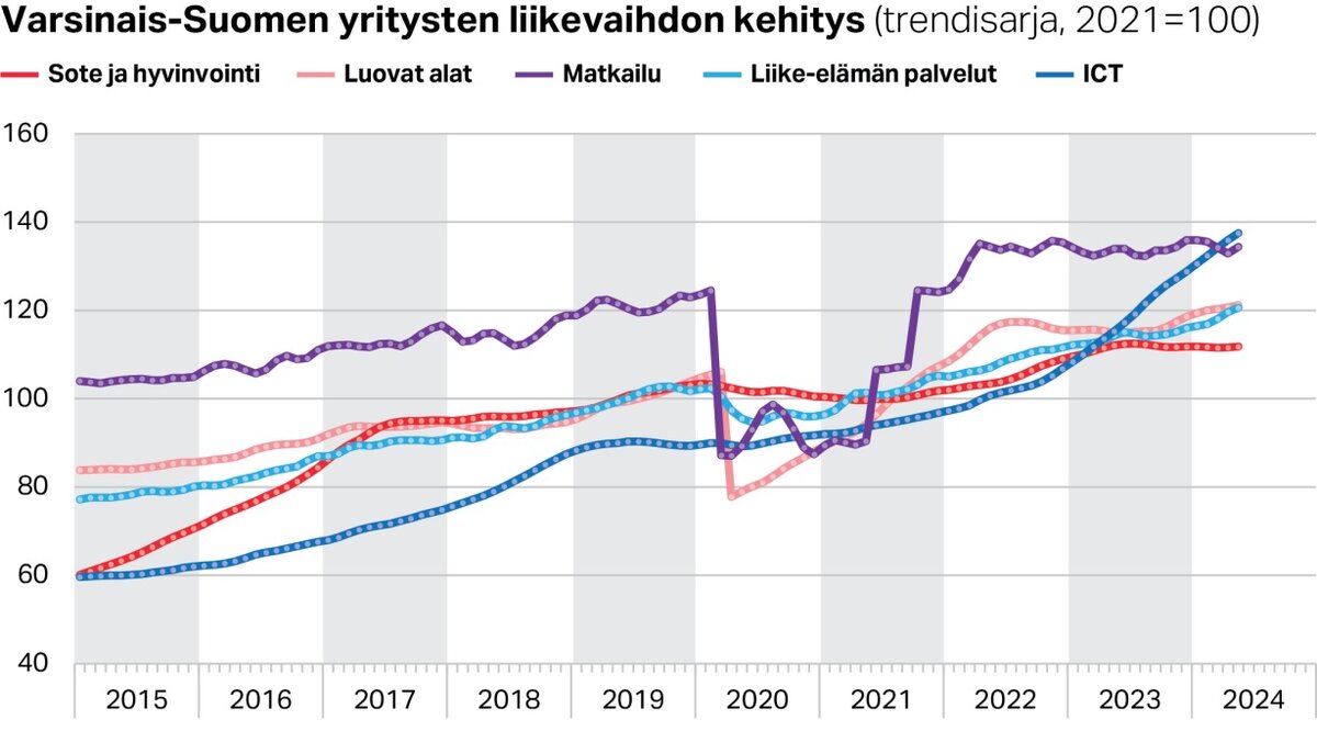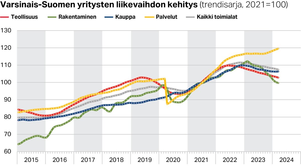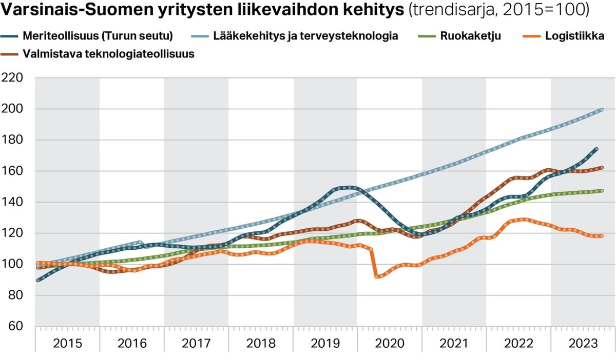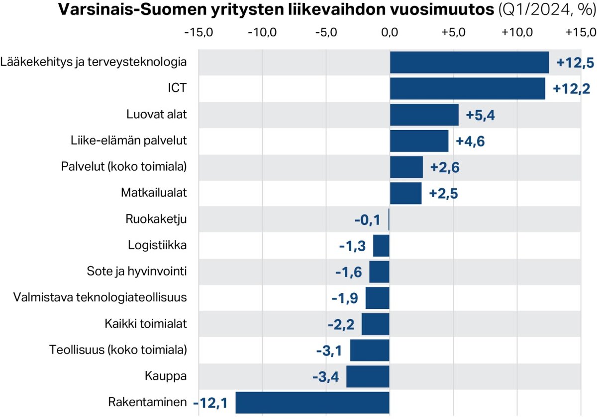Yritysten liikevaihdon kehityksen painaa miinusmerkkiseksi erityisesti suurten päätoimialojen vaisu kehitys. Teollisuus ja kauppa olivat noin kolmen prosentin laskussa ja rakennusala romahti jopa 12 prosenttia edellisvuotisesta. Sen sijaan Varsinais-Suomen vahvat kärkialat kasvoivat ripeästi. Selvästi vahvinta kasvu oli lääkekehityksessä ja terveys-teknologiassa sekä ICT-alalla, mutta myös luovat alat ja liike-elämän palvelut kasvoivat nopeasti. Ne eivät yksistään kyenneet nostamaan koko maakunnan suhdannekehitystä kasvuun.
