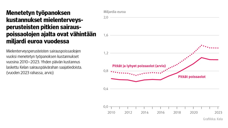 Mielenterveysperusteisten pitkien sairauspoissaolojen menetetyt kustannukset ovat viime vuosien aikana olleet hieman yli miljardi euroa vuodessa, jos kustannus lasketaan sairauspäivärahan saajien tulojen mukaan. Kustannukset ovat kymmenessä vuodessa kasvaneet melkein puolella miljardilla eurolla, lähes 90 prosentilla, kun inflaatio huomioidaan.