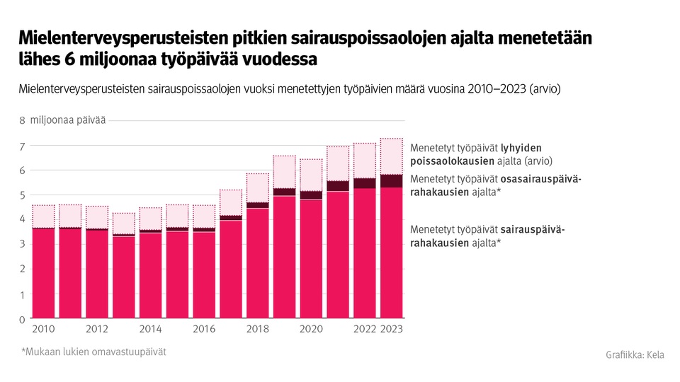 Pitkien mielenterveysperusteisten sairauspoissaolojen vuoksi menetettiin Suomessa arviolta 5,8 miljoonaa työpäivää tai 26 000 henkilötyövuotta vuonna 2023. Menetettyjen päivien kustannus oli laskutavasta riippuen vähintään miljardi euroa. Kustannukset ovat kasvaneet huomattavasti kymmenessä vuodessa.