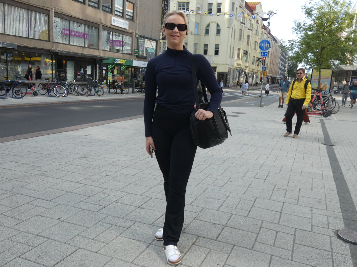– Pukeutumiseni on aika sporttia, sillä olen menossa kuntoilemaan. Säähän nähden ehkä vähän kuuma, mutta, lämmittelyä varten olen valinnut nämä vaatteet, kuvailee Emmi Paakkanen, 24.