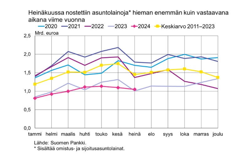 Suomalaiset kotitaloudet nostivat heinäkuussa uusia asuntolainoja maltillisesti eli miljardin euron edestä, mikä on 4,3 prosenttia enemmän kuin edellisvuoden heinäkuussa ja 27,8 prosenttia vähemmän kuin heinäkuussa keskimäärin vuosina 2011–23. Heinäkuu on tyypillisesti hiljainen asuntolainojen nostokuukausi.