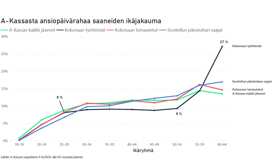 A-kassan etuudensaajien ikäjakaumatilasto osoittaa, että työttömyys keskittyy vanhempiin ikäluokkiin. Alle 45–50-vuotiaiden joukossa kokonaan työttömiä, lomautettuja ja sovitellun päivärahan saajia (työttömyysaikanaan osittain työllistyviä) on suhteellisesti vähemmän kuin saman ikäisiä kassan jäseniä. 50 ikävuoden jälkeen lomautettujen ja sovitellun päivärahan saajien osuus on suurempi kuin saman ikäisten jäsenten osuus kassan jäsenistä. Yli 55-vuotiailla kokonaan työttömien osuus ylittää heidän ikäryhmänsä osuuden kassan jäsenistä. Tämän jälkeen työllistyminen näyttää selvästi vaikeutuvan.
