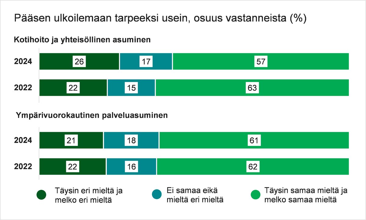 Ulkoilun määrään tyytyväisten kotihoidon asiakkaiden osuus on laskenut 63 prosentista 57 prosenttiin vuodesta 2022, selviää Terveyden ja hyvinvoinnin laitoksen (THL) vanhuspalvelujen asiakastyytyväisyyskyselystä. Vastaavaa muutosta ei ollut ympärivuorokautisessa palveluasumisessa, jossa hieman yli 60 prosenttia koki ulkoilun määrän olevan riittävä molempina vuosina.