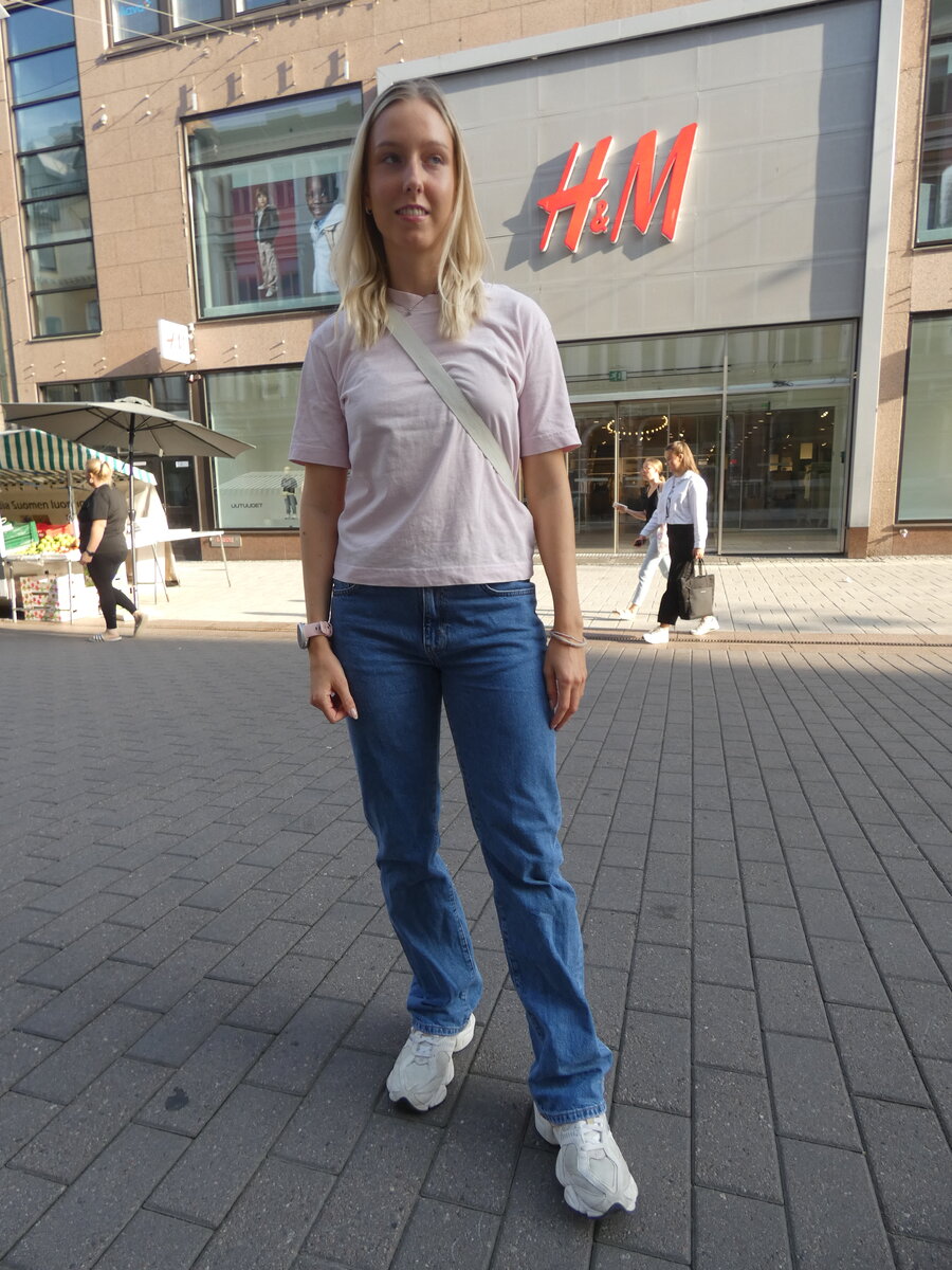 – En seuraa niin sanottuja muotijuttuja. Seuraan kuitenkin sosiaalista mediaa ja saan sieltä vaikutteita. Shoppailessa ostan sellaisia vaatteita, mikä näyttää omaan silmään kivalta ja mikä on mukavin päällä, sanoo Aada Aho, 21.