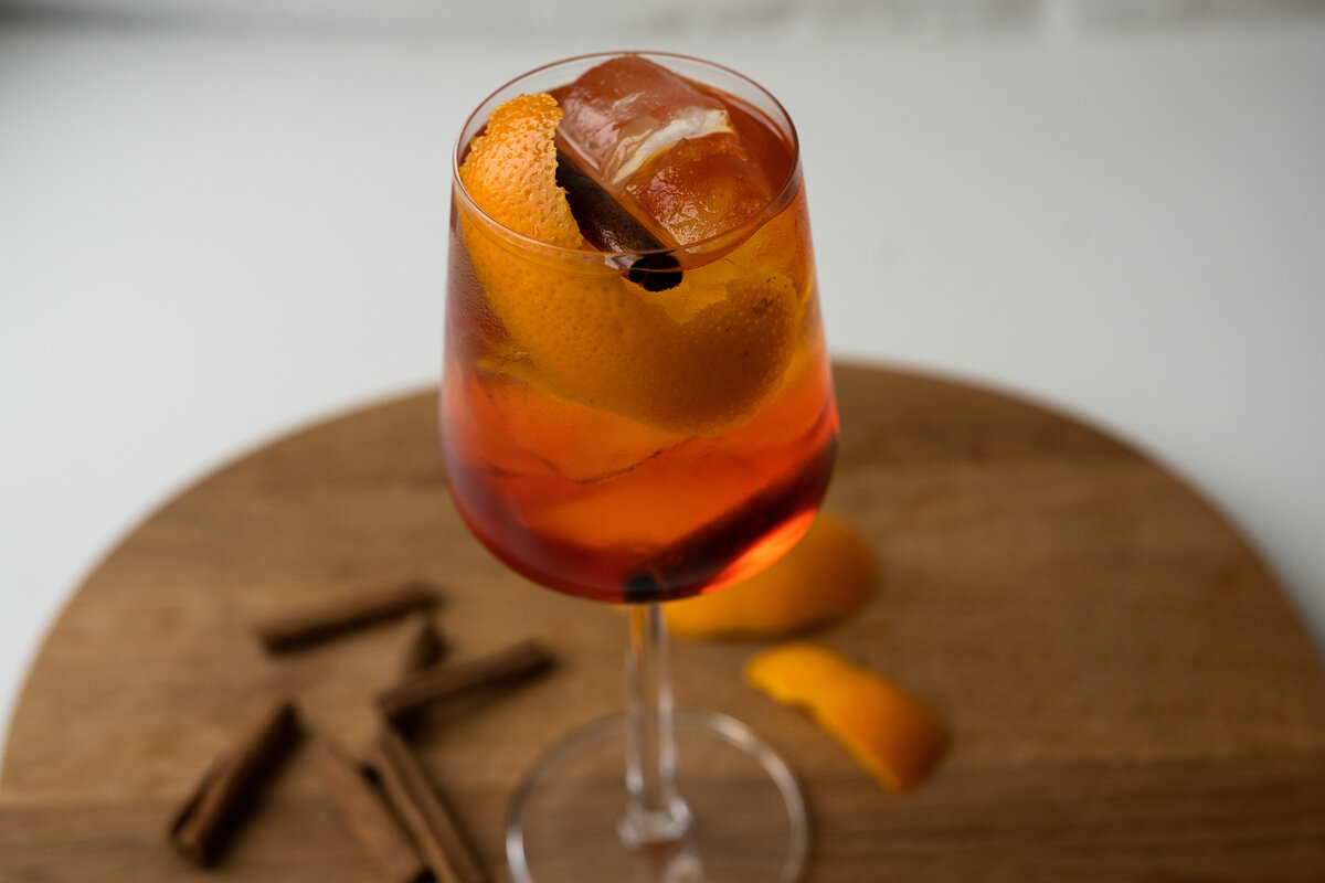 Drinkki on yksinkertaisuudessaan nerokas, sillä siihen tulee vain muutama ainesosa. Tämä syksyinen versio maustetaan kanelitangolla ja omenamehulla perinteisen soodan sijaan. Omenamehua voi maustaa kanelitangon kera pidempäänkin jääkaapissa, jos haluaa juomaan vielä lisää kanelin makua. Jäissä ei kannata säästellä, vaan niin perinteisessä Aperol Spritzissä, kuten tässäkin drinkissä niillä täytetään lasi kokonaan. Drinkki koristellaan vielä appelsiinin kuorella.