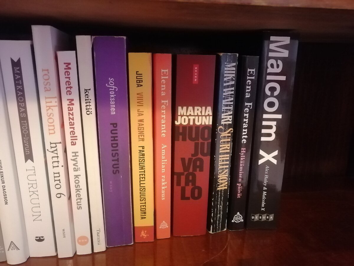 Eri kokoisten kirjojen järjestäminen muun kuin hyllytilan raameissa voi olla haastavaa. Omassa funkkishyllyssä ratkaisuna on pistää pokkarit matalimmalle riville, mutta pitäisikö ne asetella pituus- vai värijärjestykseen? Seinähyllyssä on käytössä värisuora, ja kirjakärrystä löytyvät rumimmat teokset. Sinne ovat päätyneet myös natsi-Saksasta ja Putinin Venäjästä kertovat pahan mielen kirjat. Vaunun saa kätevästi piiloon niin halutessa. Tiedän kuitenkin heti, mistä kirjani löydän.