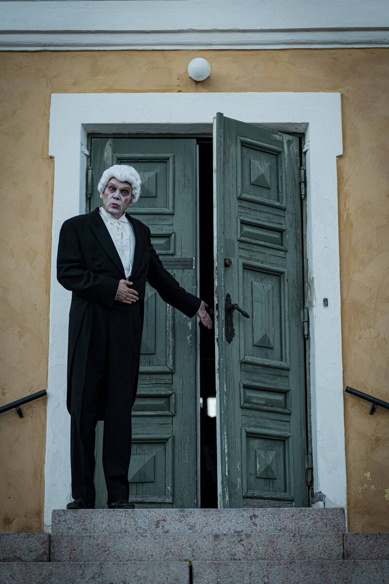 – Hyödynnämme kartanon rakennuttajan Gabriel von Bonsdorffin akateemista uraa Turun Akatemian anatomian professorina. Tosin aivan ei totuudessa pysytä, koska meidän versiossamme kartanoa isännöi Gabriel von Brinkenstein, nauraa esityksessä näyttelevä ja puvustuksesta sekä tarpeistosta vastaava Anniina Kuula.