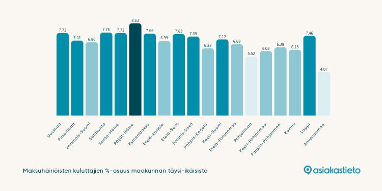 Väkilukuun suhteutettuna eniten maksuhäiriöisiä täysi-ikäisiä on Päijät-Hämeessä, vähiten Ahvenanmaalla.
