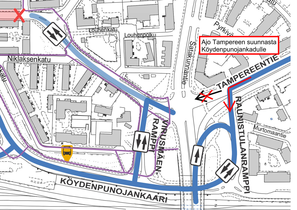 Ajoyhteys Tampereentien suunnasta Köydenpunojankadulle muuttuu. Tampereentieltä käännytään ennen Satakunnantien risteystä Raunistulanrampista vasemmalle Köydenpunojankaarelle. Ajoyhteys Yrjänänkatua pitkin Köydenpunojankadulle jää asukkaiden käyttöön. Myös jalankulkuyhteys Yrjänänkadun kautta säilyy.