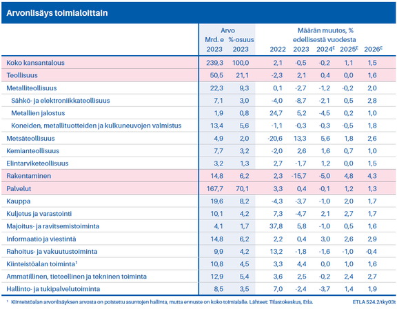 Koko kansantalouden arvonlisäys supistuu vielä hieman tänä vuonna, mutta lähtee loivaan nousuun ensi vuonna, kun rakentaminen ja palvelusektori toipuvat. Elinkeinoelämän tutkimuslaitoksen tuoreen toimialakohtaisen ennusteen mukaan Suomen teollisuuden arvonlisäys jää ensi vuonna kuluvan vuoden lukemiin, palvelualat pääsevät runsaan prosentin kasvuun, ja rakentaminen elpyy liki viiden prosentin kasvuun. Tuotoksella mitattuna myös teollisuustuotanto kääntyy kasvuun ensi vuonna, mutta arvonlisäys kehittyy huomattavasti heikommin. Metalliteollisuus jarruttaa nyt teollisuustuotantoa. Paperin ja kartongin vienti vetää jo, ensi vuonna myös sähkö- ja elektroniikkatuotteiden vienti kääntyy vahvaan kasvuun.