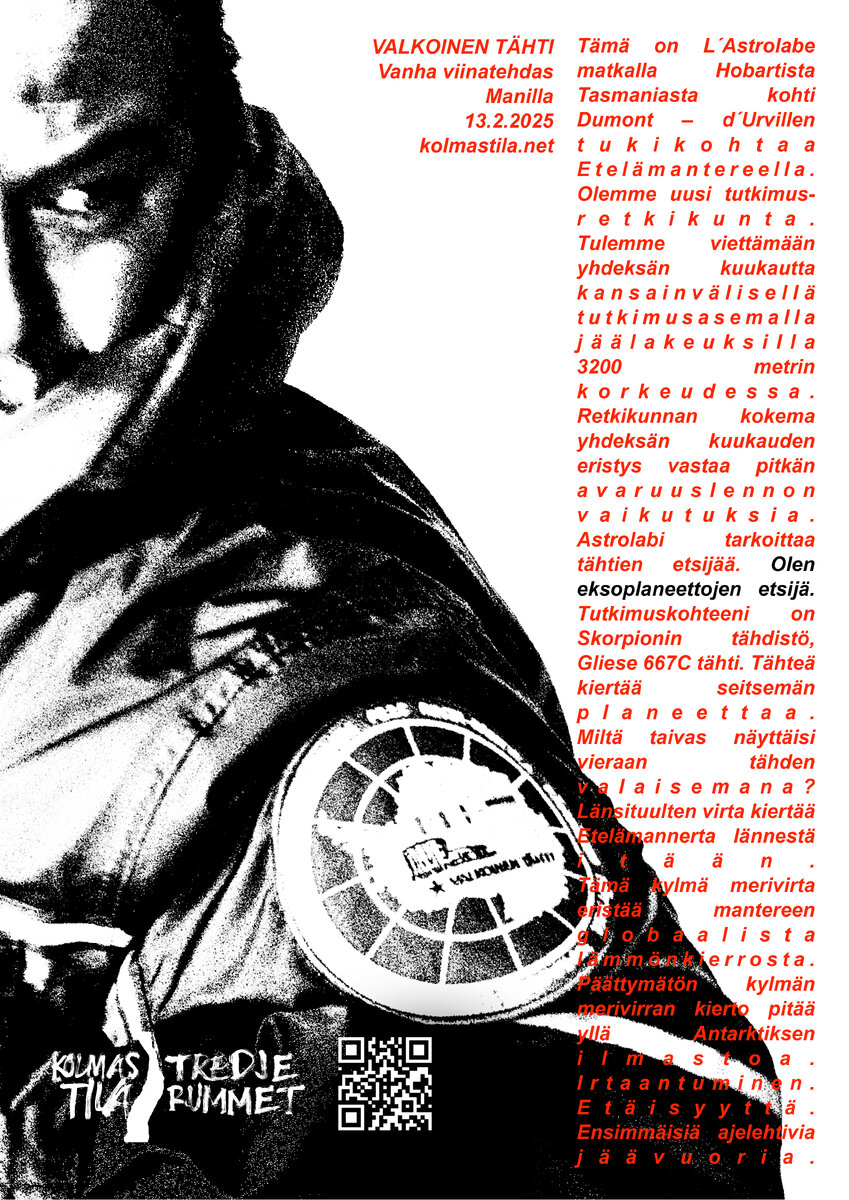 Kolmas Tila tuo uuden näyttämöteoksensa Valkoinen tähti ensi-iltaan 13. helmikuuta. Valkoinen tähti käsittelee Etelämannerta, siellä tehtävää tieteellistä työtä, tuon työn etiikkaa ja aktivismia sekä mantereen paikkaa ja merkitystä planeettamme elämälle ja sen historialle, myös sen tulevaisuudelle. Dokumentaarista tietoa, tutkimustietoa ja fiktiota yhdistävän teoksen lähtökohtana ja olosuhteena on planeetan ilmastohätätila.