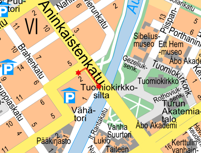Aninkaistenkadulla tehdään arkeologisia koekaivauksia maanantaista 4. marraskuuta alkaen. Oikeanpuoleinen ajokaista Tuomiokirkon suuntaan on poissa käytöstä Eerikinkadun ja Tuomiokirkkosillan välillä. Ajoneuvojen kääntyminen Aninkaistenkadulta Vähätorin suuntaan on kielletty töiden ajan. Vähätorilla sijaitsevien kiinteistöjen huoltoliikenne tapahtuu Brahenkadun ja Linnankadun risteyksen kautta.