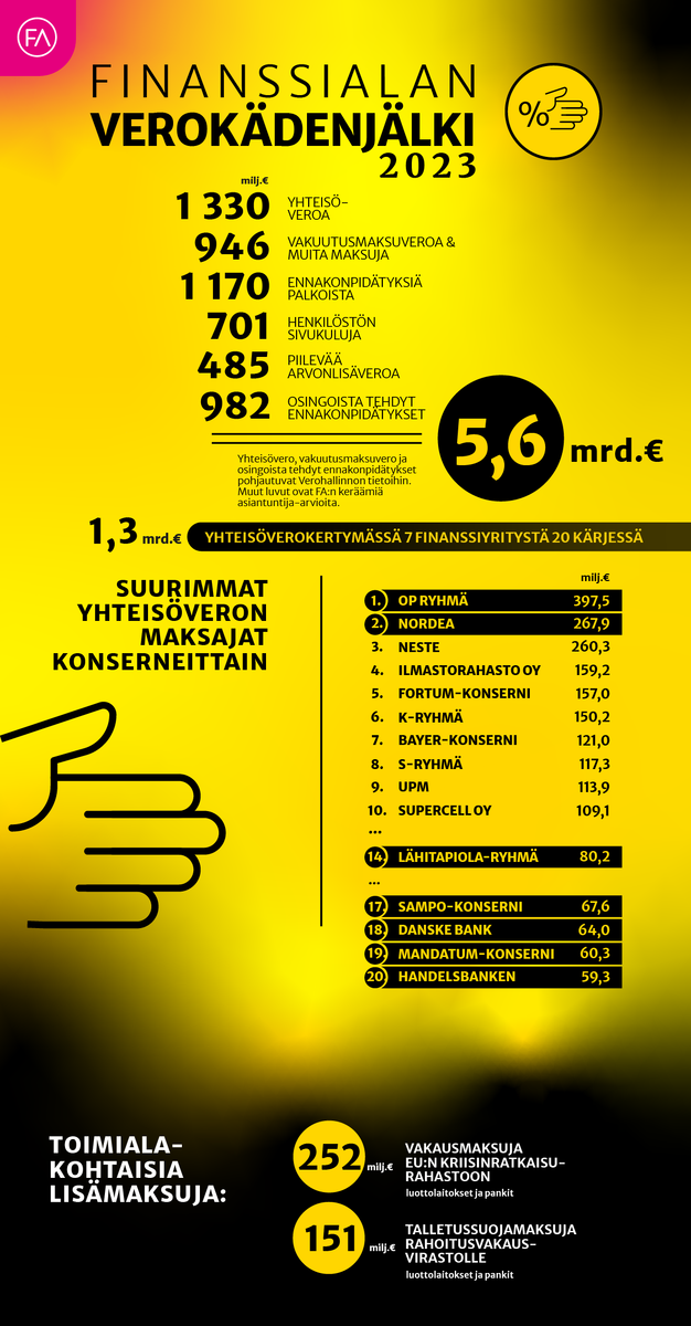 Finanssialan yhtiöryhmien tiedot yhdistettiin verohallinnon julkisten tietojen perusteella. Myös muiden kuin finanssialan yhtiöiden luvut on laskettu konsernitasolla.