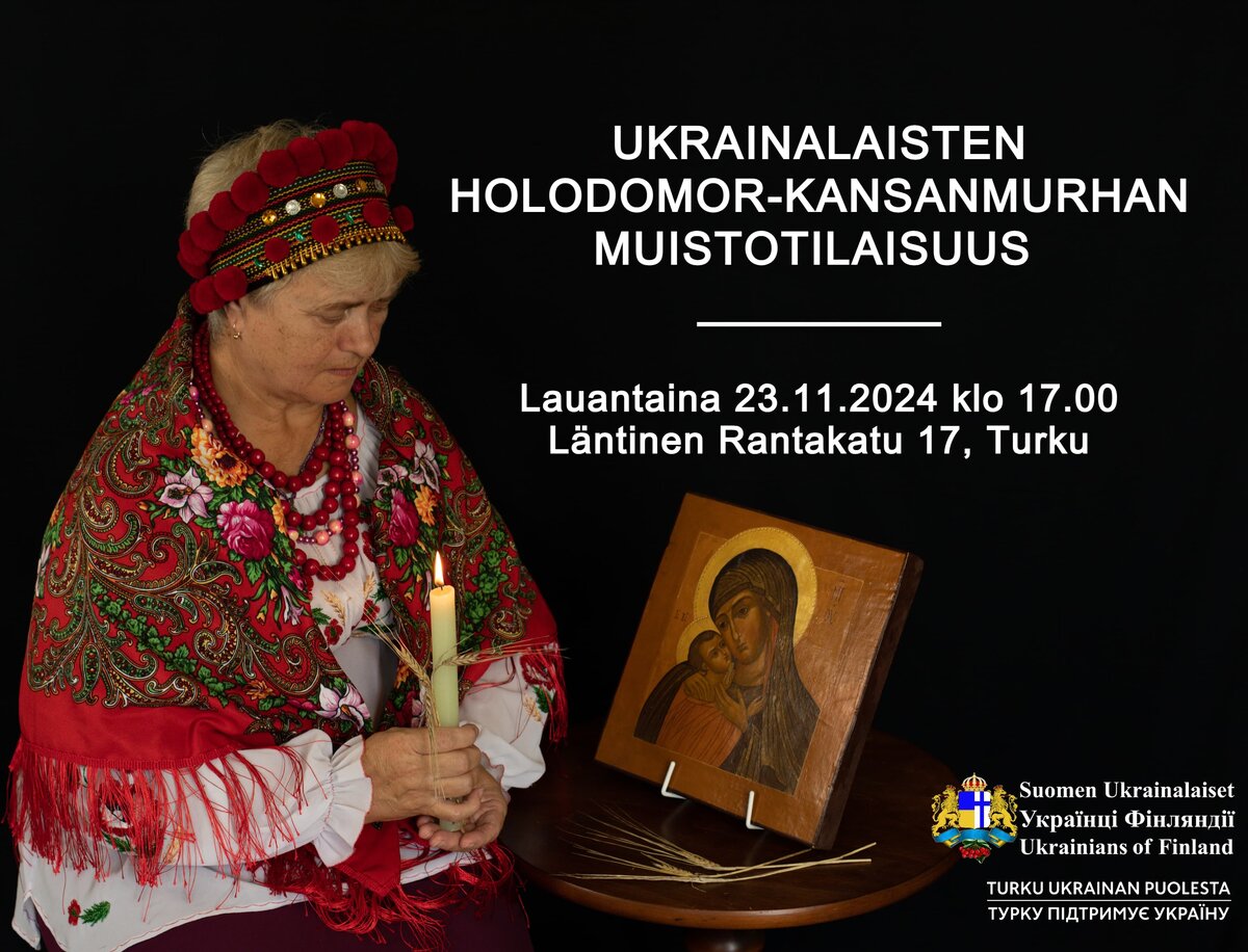 Suomen Ukrainalaiset ry ja Turku Ukrainan puolesta -ryhmä järjestävät muistotilaisuuden holodomorin uhreille lauantaina 23. marraskuuta kello 17.00–17.45.