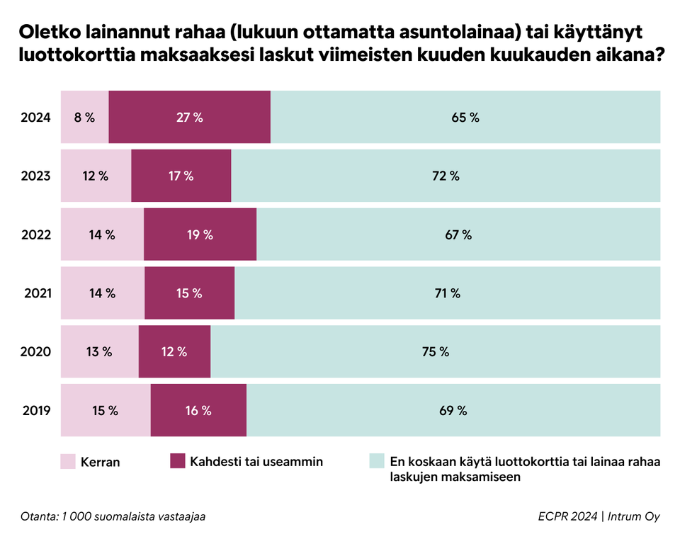 Suomalaisista kuluttajista 63 prosenttia maksoi edellisten 12 kuukauden aikana laskunsa ajallaan, mikä on enemmän kuin 56 prosenttia viime vuonna. Kolikon kääntöpuolena on kuitenkin huolestuttava ilmiö, sillä aiempaa useampi kertoi viimeisten kuuden kuukauden aikana ottaneensa lainaa tai käyttäneensä loppuun luottokorttinsa limiitin maksaakseen laskunsa. Luotonhallintayhtiö Intrumin Eurooppalainen kuluttajien maksutaparaportti paljastaa, että suomalaisista 35 prosenttia kertoi maksaneensa laskuja luotolla, mikä on enemmän kuin 29 prosenttia vuonna 2023. Viime vuoteen ja edeltäneisiin vuosiin verrattuna kasvua on ollut nimenomaan toistuvassa luoton käytössä. Sen sijaan kertaluonteisesti luottoa laskun maksuun käyttäneiden määrä laski. Kuluttajista 15 prosenttia kertoi myös, että heillä on vaikeuksia selviytyä veloistaan, kun eurooppalaisista keskimäärin kahdeksan prosenttia vastasi näin.