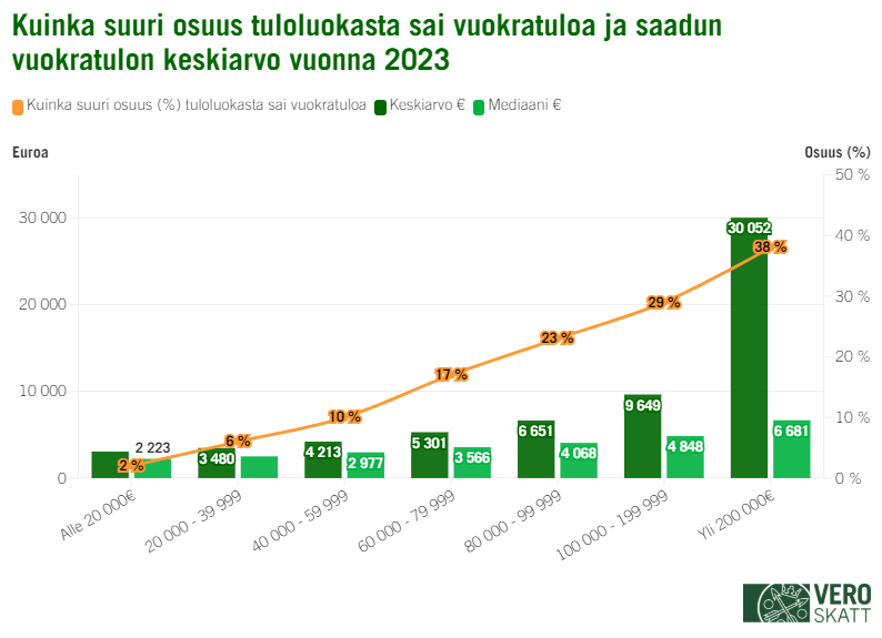 Yleisimmin vuokratuloja saatiin korkeammissa tuloluokissa: alle 20 000 euroa tienanneista 2 prosentilla ja yli 200 000 euroa tienanneista 38 prosentilla oli vuokratuloja.