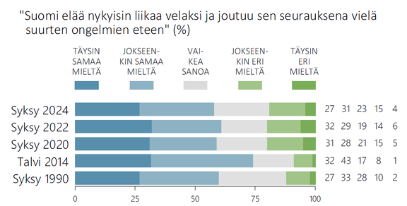 Enemmistö suomalaisista (58 %) katsoo Suomen elävän liikaa velaksi ja joutuvan sen seurauksena vielä suurten ongelmien eteen. Enemmistö perussuomalaisten (91 %) ja kokoomuksen (87 %), Liike Nytin (87 %), kristillisdemokraattien (83 %), RKP:n (69 %) ja keskustan (64 %) kannattajista on huolissaan velkaantumisesta. Vihreiden (44 %), SDP:n (30 %) ja Vasemmistoliiton (10 %) kannattajista vain vähemmistö jakaa tämän näkemyksen.