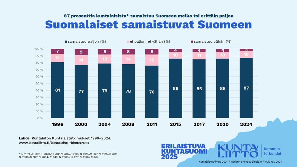 Kuntaliiton Kuntalaistutkimuksen 2024 tulokset paljastavat, että valtaosa vastaajista (87 %, n=10 500) samaistuu Suomeen melko tai erittäin paljon, ja osuus on pysynyt vakaana vuodesta 2015 lähtien. Suomalaisuus ja kansallinen identiteetti pysyvät suomalaisten tärkeimpänä kiinnittymiskohtana muuttuvasta maailmasta huolimatta.