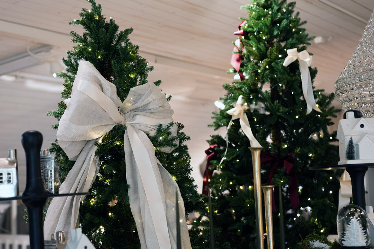 Trendikäs joulukuusi saa ympärilleen muhkean rusetin