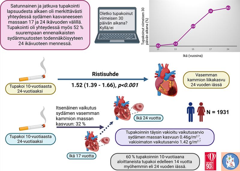 Jatkuva tupakointi 10-vuotiaasta 24-vuotiaaksi oli yhteydessä 52 prosenttia suurempaan varhaisten sydänmuutosten, kuten sydämen liikakasvun sekä vasemman kammion diastolisen toimintahäiriön ja kohonneen täyttöpaineen riskiin 24 vuoden ikään mennessä. Kun huomioon otettiin muut riskitekijät, kuten kohonnut verenpaine, lihavuus, hiljainen tulehdus, veren epänormaalit rasva-arvot ja paikallaanolo, tupakointi selitti 30 prosenttia sydämen liikakasvusta 17 ja 24 ikävuoden välillä.