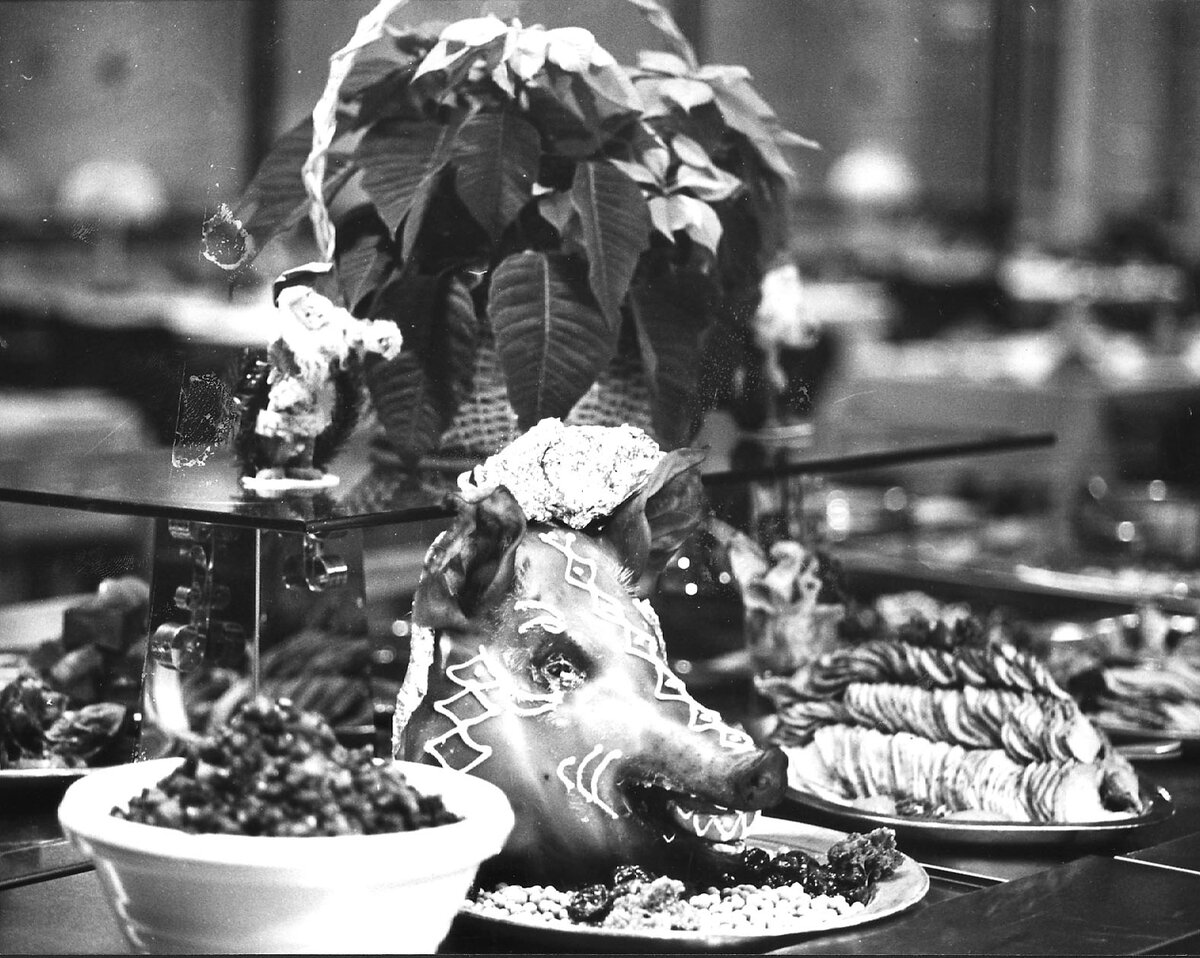 Ennen oli todellisuus toisenlainen. Kuva on nimeämättömän turkulaisen hotellin joulupöydästä vuodelta 1980. Laatikoita, rosollia ja kinkkua, vieläpä sianpään kera. Sianpääsyltty toki on vanha perinneruoka, mutta enää sitä ei joulupöydissä näe. Mikä on ihan hyvästä.
