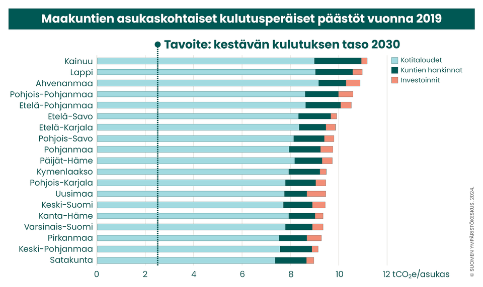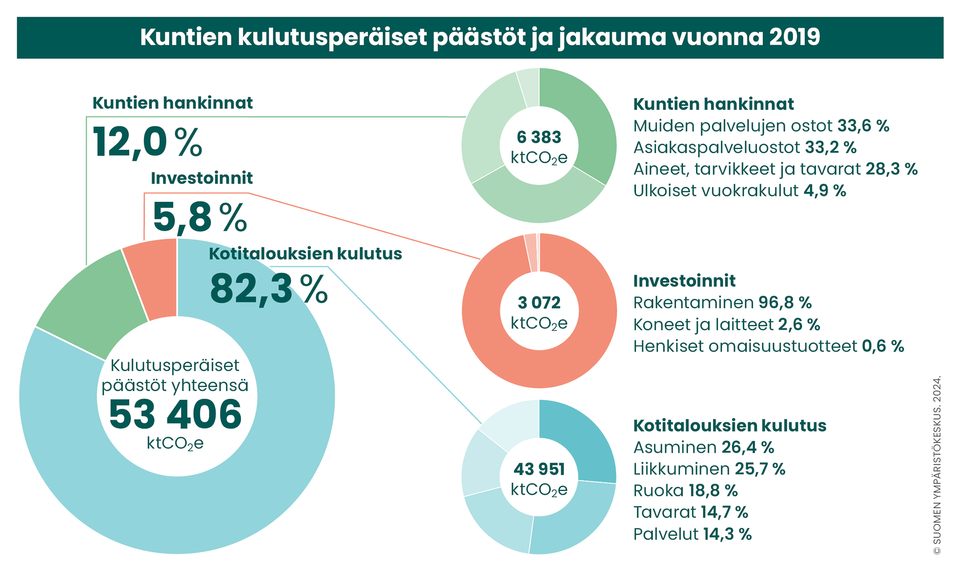 Kuntien asukaskohtaiset kulutusperäiset päästöt vaihtelivat 7,7 ja 12,5 tCO2e välillä. Tästä kotitalouksien kulutuksen osuus on noin 82 prosenttia vaihdellen kunnan mukaan 6,1 ja 10,4 tonnin välillä. Kuntien hankintojen osuus on noin 12 prosenttia ja investointien loput kuusi prosenttia.