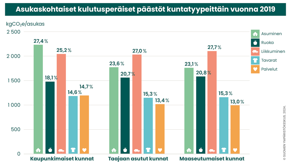 Tavaroiden kokonaiskulutuksen osalta aluetyyppien välillä ei ole merkittäviä eroja. Palveluihin liittyviä päästöjä muodostuu selvästi eniten kaupunkimaisissa kunnissa, joissa palveluja on enemmän tarjolla kuin maaseutumaisissa kunnissa.