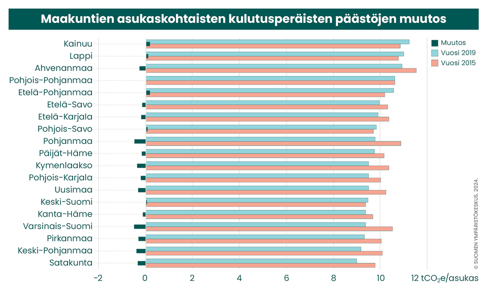Asukaskohtaiset päästöt pienenivät vuodesta 2015 eniten Pohjanmaalla ja Varsinais-Suomessa, kun taas päästöjen kasvu oli suurinta Kainuussa ja Etelä-Pohjanmaalla.