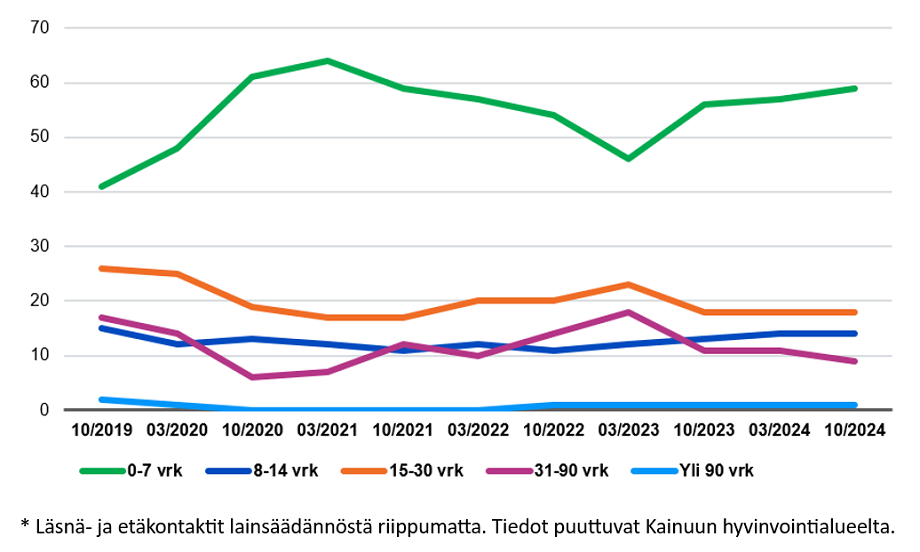 Lääkärin hoitoon pääsi hieman nopeammin syksyllä saman vuoden kevääseen verrattuna. Kiireetön hoito avosairaanhoidon lääkärille toteutui lokakuussa kahden viikon kuluessa yhteydenotosta ja terveydenhuollon ammattilaisen tekemästä hoidon tarpeen arviosta 73 prosentissa käynneistä. Maaliskuussa 71 prosenttia käynneistä toteutui kahdessa viikossa.