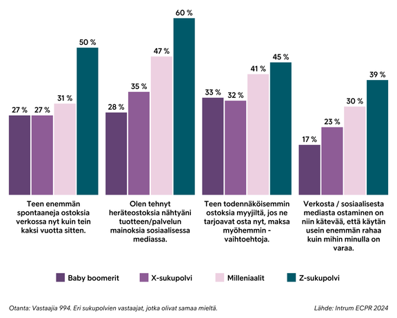 Nuorista aikuisista puolet (50 prosenttia) kertoo tekevänsä nyt enemmän heräteostoksia verkossa kuin kaksi vuotta sitten ja 39 prosenttia ostaa enemmän kuin mihin heillä olisi varaa, kertoo luotonhallintayhtiö Intrumin Eurooppalainen kuluttajien maksutaparaportti. Kaikissa ikäryhmissä heräteostoksia verkossa tekee aiempaa enemmän 31 prosenttia ja yli varojensa verkko-ostoksia tekee 26 prosenttia kuluttajista. Suomalaisista kuluttajista 39 prosenttia on tehnyt heräteostoksia nähtyään tuotteen tai palvelun mainoksen sosiaalisessa mediassa. Huolestuttavaa on, että 18-27-vuotiaiden vastaajien, eli Z-sukupolven ikäryhmässä luku nousee 60 prosenttiin, mikä on enemmän kuin samassa ikäryhmässä Euroopassa keskimäärin (51 prosenttia). Intrumin perintädatan analyysin mukaan samaan aikaan, kun harkitsemattomien hankintojen määrä on lisääntynyt myös nuorten 18-24-vuotiaiden aikuisten perintään siirtyvien maksujen määrä on kasvanut.