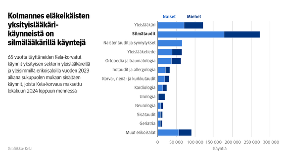 Eläkeikäiset eli 65 vuotta täyttäneet saivat vuonna 2023 Kela-korvauksia yhteensä vajaasta 825 000 yksityislääkärikäynnistä. Julkisessa perusterveydenhuollossa eläkeikäiset kävivät vajaa 2,3 miljoonaa kertaa. Kelan tutkijat selvittivät, miten eläkeikäisten yksityislääkärikäynnit jakautuivat sukupuolten, eri tuloryhmien ja erikoisalojen välillä.