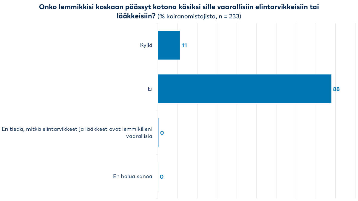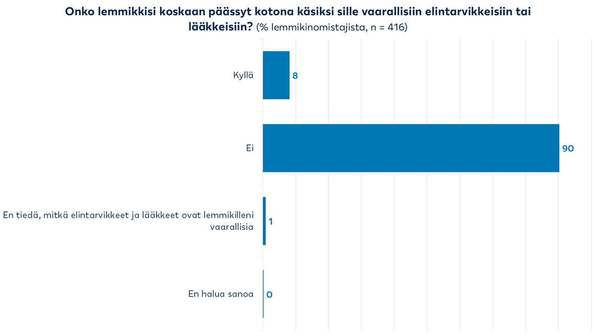 Kyselyn perusteella tilanteet, joissa lemmikki pääsee kotona käsiksi sille vaarallisiin elintarvikkeisiin tai lääkkeisiin, ovat selvästi yleisempiä nuorimmilla lemmikinomistajilla. Alle 25-vuotiaista vastaajista joka viides (20 %) kertoi lemmikkinsä päässeen käsiksi sille vaarallisiin elintarvikkeisiin tai lääkkeisiin.