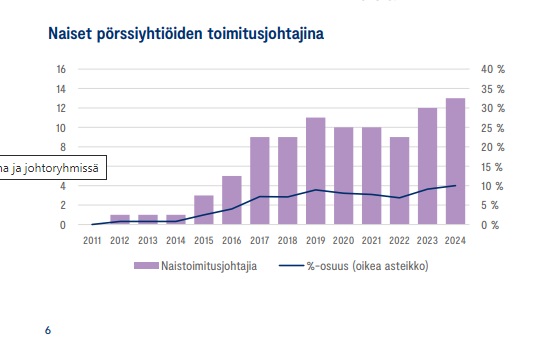 Naistoimitusjohtajien määrässä ja osuudessa saavutettiin uusi ennätys. Naistoimitusjohtajia on pörssiyhtiöissä nyt 13, mikä vastaa kymmenen prosenttia kaikista pörssiyhtiöiden toimitusjohtajista.