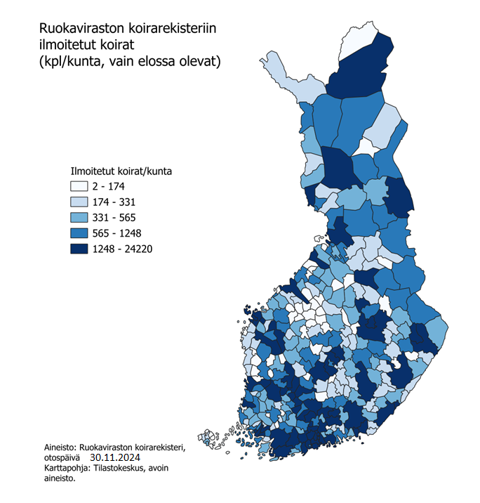 Marraskuun lopussa koiria oli rekisterissä 321 750, eli arviolta vajaa puolet suomalaisten koirien määrästä. Muiden maiden kokemuksista tiedetään, että koirien kattava rekisteriin ilmoittaminen vie aikaa jopa vuosia.