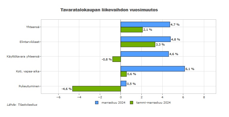 Liikevaihto laski tammi–marraskuussa pukeutumisen tuoteryhmässä 4,6 prosenttia tammi–marraskuusta 2023. Samaan aikaan kodin ja vapaa-ajan tuoteryhmän liikevaihto kasvoi 0,6 prosenttia. Kaikkiaan käyttötavara yhteensä -tuoteryhmän liikevaihto laski 0,8 prosenttia. Elintarvikkeiden tuoteryhmässä liikevaihto kasvoi yhteensä 3,3 prosenttia edellisvuoden vastaavasta ajanjaksosta.