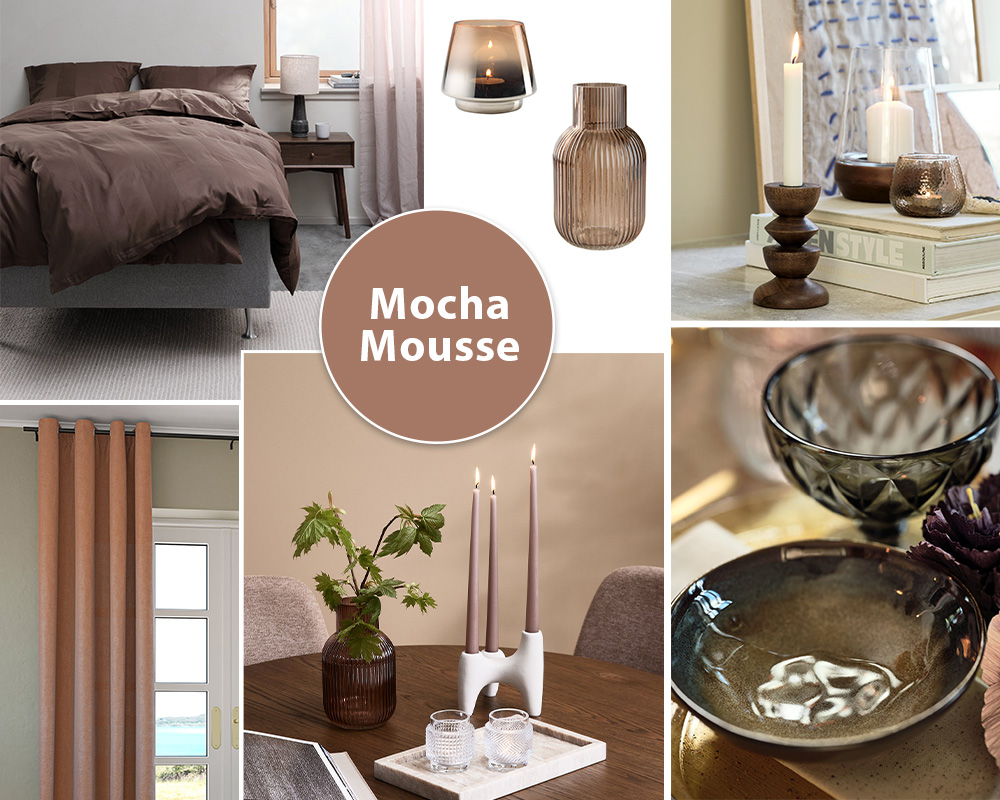 Mocha Mousse toimii hyvin sekä moderneissa että perinteisissä sisustuksissa ja täydentää sävyjä kuten kerma, beige, murrettu vaaleanpunainen, tummanvihreä ja petroolinsininen.