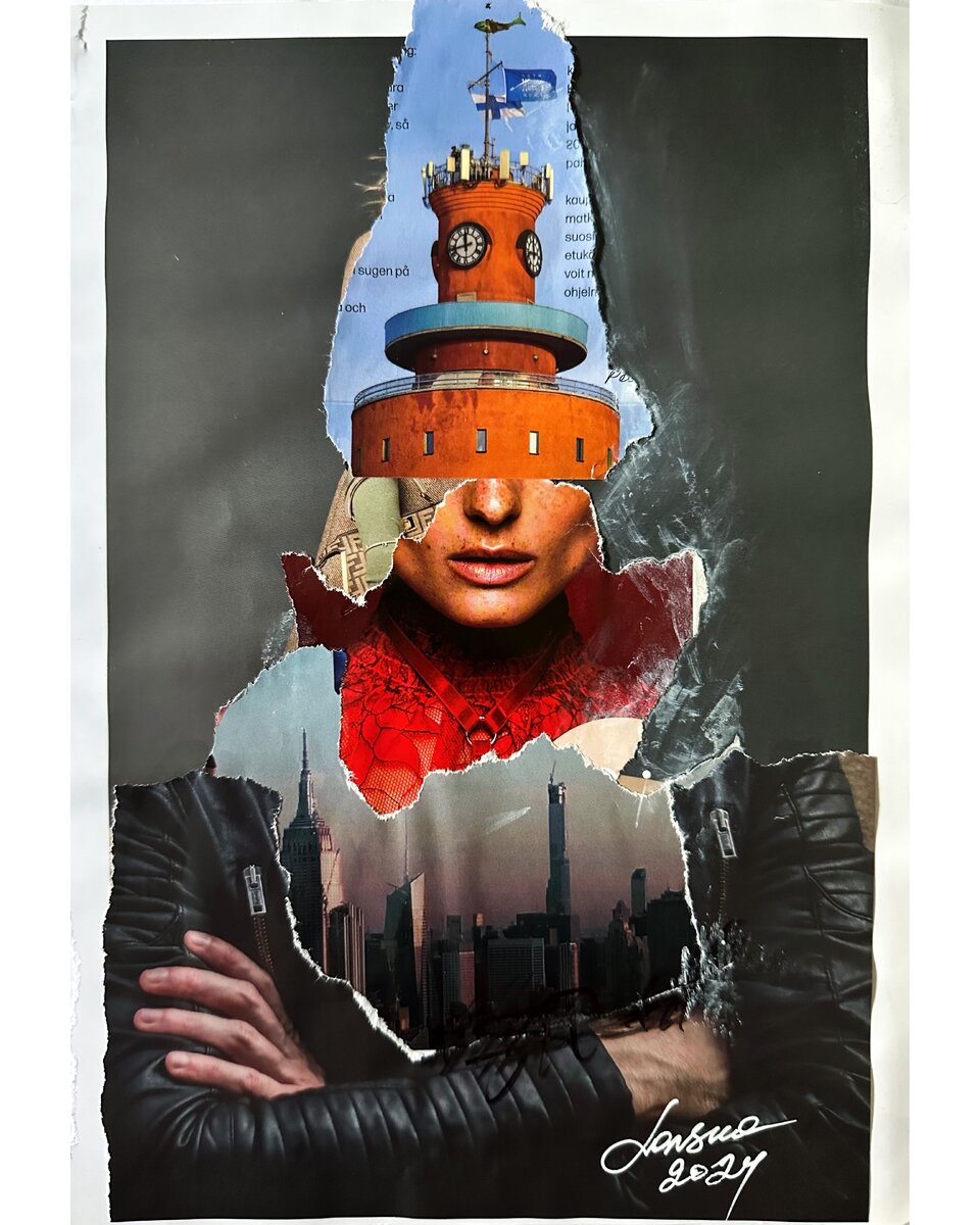 Kollaasi on metafora elämän havaitsemiselle, jossa kohtaamme päivittäin sirpaleita todellisuudesta ja yhdistämme ne kokonaiseksi käsitykseksi maailmasta. Aikakauslehtileikkeet symboloivat modernin ajan visuaalista kohinaa, kun taas akryylimaalaukset lisäävät kirkkaita tunnepainotteisia aksentteja ja sitovat kuvat ekspressiiviseksi tarinaksi.