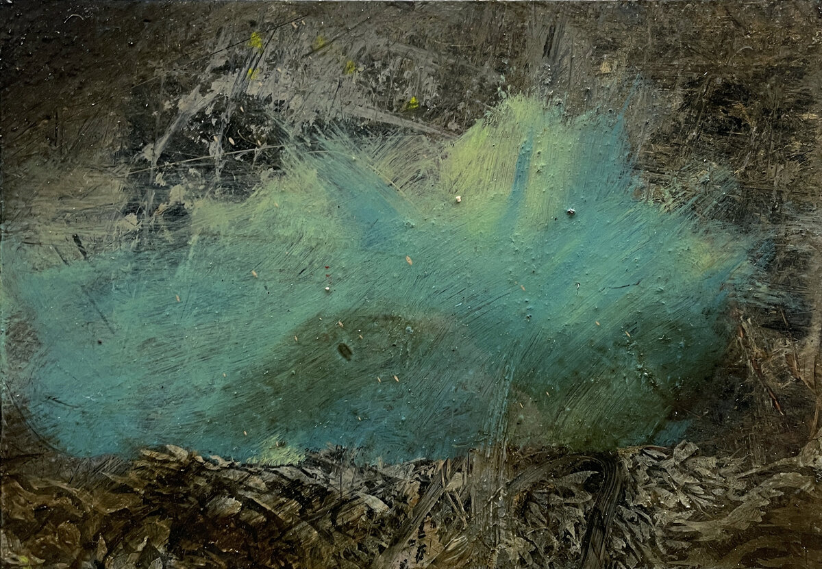 – Aloin maalata öljyisellä temperalla muuttaessani työhuoneen Barkerille Turkuun vuoden 2020 lopussa. Kiinnostuin tuolloin syvemmin temperan ja maalausnesteiden tuomista mahdollisuuksista, sekä siitä minkälaista pintaa ja patinaa voi maalata kerroksittain. En arvannut tuolloin että tämä veisi mennessään ja kuinka pitkä prosessista loppujen lopuksi tuleekaan. Osa teoksista on kulkeutunut vuosien aikana mukana muuttaen muotoaan ja lojuen välillä varastossa. Palaan näihin pohjiin aika ajoin ja aloitan samalla uusia. Galleria Askissa olevat teokset ovat syntyneet ajan, historian, hetkellisten impulssien, väliaikaisuuden, epävarmuuden, kokeilunhalun, elämän ja kuoleman pohdinnan tuloksena, kertoo Nampajärvi tiedotteessa.