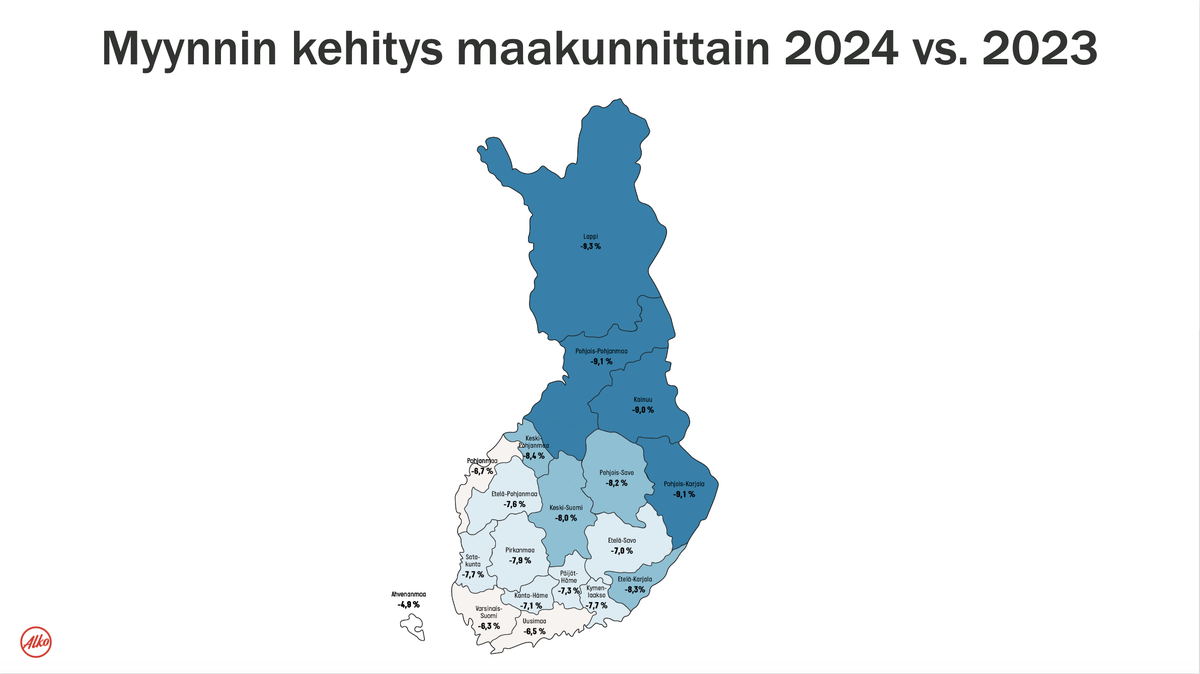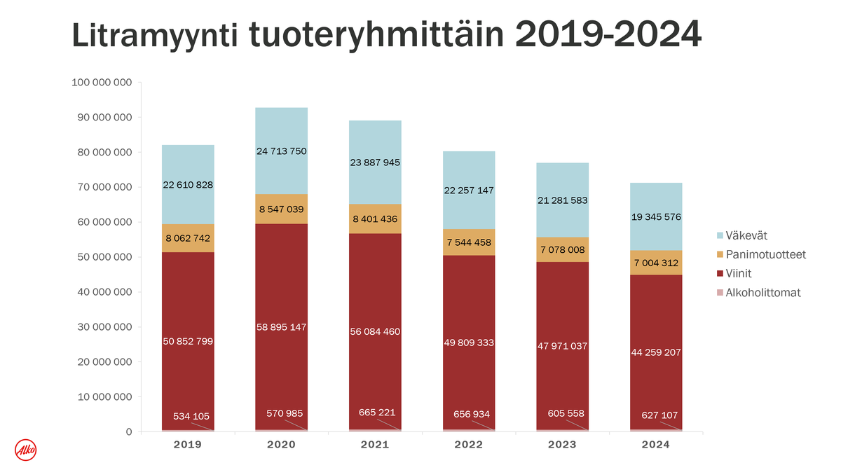 Vuonna 2024 viinien myyntilitrat laskivat 7,7 prosenttia ja väkevien 9,1 prosenttia. Panimotuotteiden myynti säilyi lähes ennallaan ja alkoholittomien myynti nousi 3,5 prosenttia verrattuna vuoteen 2023. Punaviinien litramyynti laski 8,7 prosenttia, kuohuviinien 8,2 prosenttia valkoviinien 6,7 prosenttia ja roseeviinien myynti 3,8 prosenttia. Laajemmat myyntitilastot löytyvät Alkon verkkosivujen myyntitilastoista.