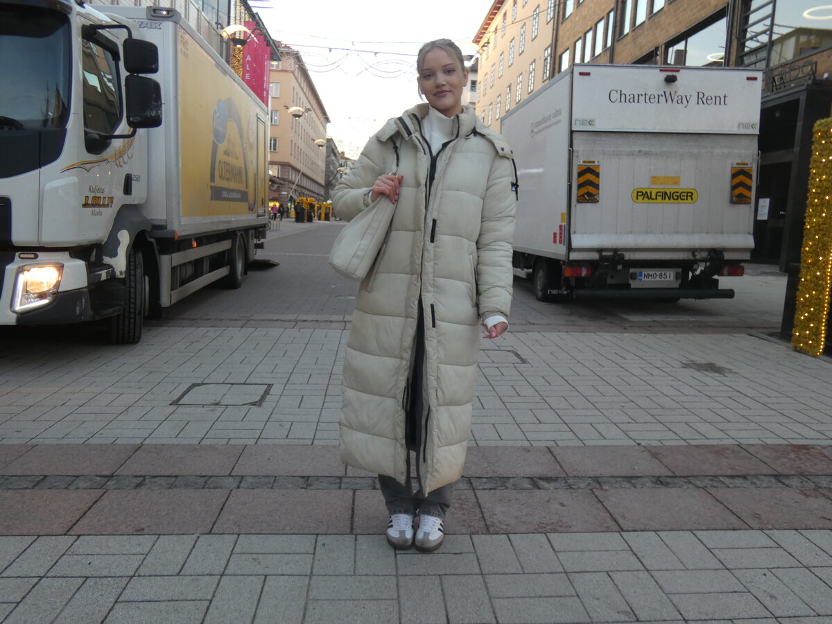 – Tällä hetkellä minulla on aika kasuaali tyyli päällä. Koska täällä on aika kylmä, niin minulla on päällä iso pitkä takki, mikä sopii varsin hyvin Suomen talveen, kertoo Maria Kalliokoski, 21.