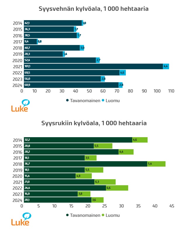 Luomuviljojen syyskylvöalat olivat samansuuruisia kuin edellisenä syksynä. Ruis on edelleen Suomessa eniten syksyisin kylvetty luomuvilja. Yli kuudesosa eli lähes 4 000 hehtaaria rukiista kylvettiin tänä syksynä luomupelloille.