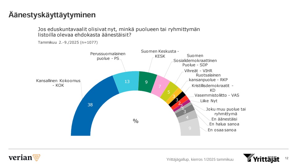 Kokoomus on edelleen ylivoimaisesti suosituin puolue yrittäjien parissa. Sitä kannattaa 38 prosenttia. Osuus on sama kuin marraskuussa. Perussuomalaiset on toisena (13 %) ja keskusta kolmantena (9 %). Niidenkin kannatusluvut ovat ennallaan.