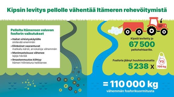 Kipsiä on vuosina 2020–24 levitetty 67 500 hehtaarille yhteensä 270 000 tonnia. Kipsinlevityksen ansiosta Itämereen päätyviä fosforipäästöjä on saatu vähennettyä jo 110 000 kiloa. Tämä tarkoittaa, että sama määrä fosforia on jäänyt pelloille kasvien käyttöön, mikä parantaa viljelykasvien ravinteidensaantia ja vähentää lannoitustarvetta. Kipsin käyttöä vesiensuojelussa on selvitetty Suomessa 20 vuoden ajan.